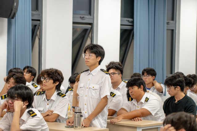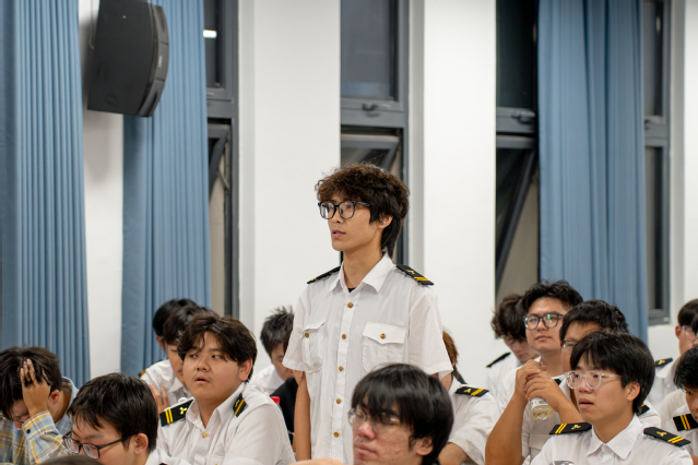 “持续学习是航海人扬帆远航的底气。”张飞轮机长结合个人成长经历,从实习生到轮机长的进阶历程中,反复强调在校期间考证与英语学习的重要性。他建议同学们通过每日词汇积累、专业知识巩固等方式提升核心竞争力,为未来职业选择拓宽空间,并以“相信自己的能力,保持虚心学习的态度,只要每天付出努力,考试并不难”鼓励在场学子坚定学习目标,克服备考困难。