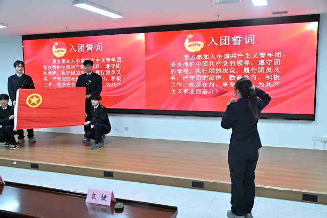 “我志愿加入中国共产主义青年团,坚决拥护中国共产党的领导……”仪式现场,全体新团员面向鲜红的团旗,举起右拳、握紧拳头,在团总支学生兼职副书记袁婕同学的领誓下,庄严宣誓。随后,全体人员起立奏唱《光荣啊,中国共青团》,青春激昂的旋律凝聚起奋进力量,激励着在场每一位青年奋勇向前。