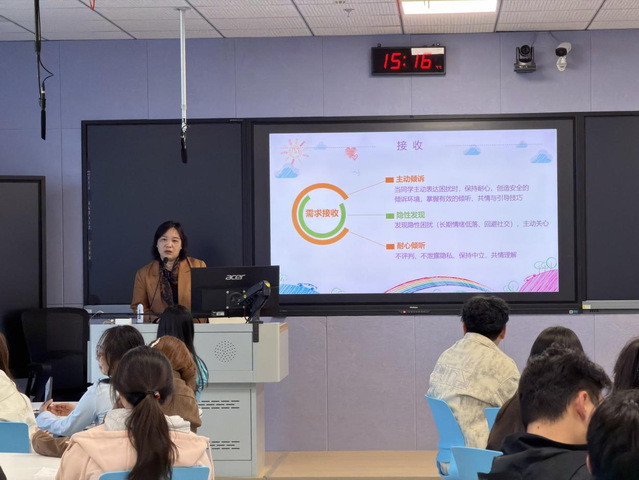 讲座中,陈艳老师明确了心理委员作为“宣传员”“支持者”的定位,详细阐述了其日常工作流程与必须遵守的保密、积极求助、实事求是及保持中立四大原则。她结合案例,重点培训了如何有效倾听、初步疏导以及进行持续跟进,并深入讲解了大学生常见心理问题的表现与识别要点。针对极端情况,陈老师特别强调了危机干预的要点,介绍了陪同者的“三规六禁”等具体行动指南,确保心理委员知晓何时及如何向辅导员或专业机构进行转介。